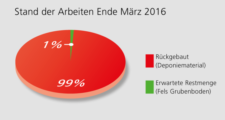 Am 23.10.2009 wurde die letzte Charge kontaminiertes Material aus dem Bereich der Manipulationshalle abgeführt. Damit konnte der erste Teil der Rückbauarbeiten der Gesamtsanierung abgeschlossen werden. Insgesamt wurden rund 158 000 t Material abgebaut und entsorgt, davon 94 000 t eingelagerte Abfälle, 53 000 t Deckschicht und 11 000 t Deponiesohle (Fels). Die bisher rückgebaute Menge entspricht rund 26 % der zu entsorgenden Gesamtmenge.